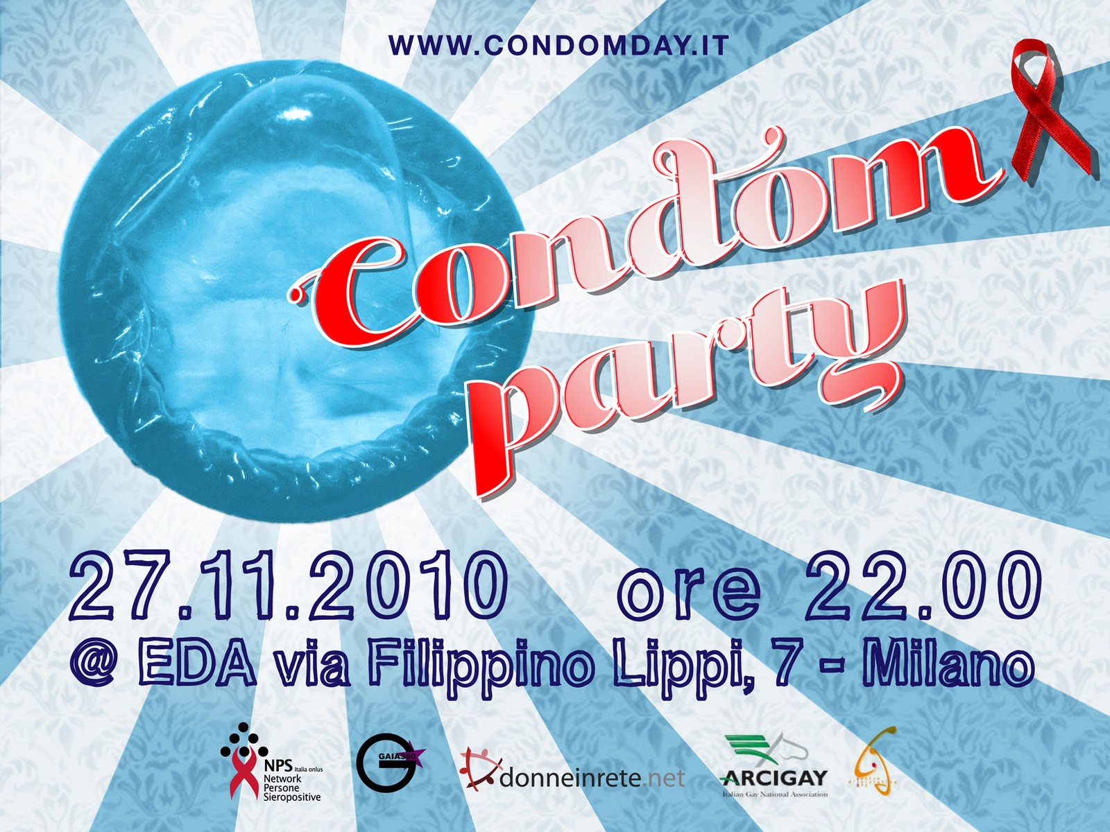 Si chiama ‘Condom Day Italy 2010’ ed è un’iniziativa promossa da NPS, network persone sieropositive, Gaia360°, Donne in rete, C.I.G centro di iniziativa Gay Arcigay Milano e con l’amichevole partecipazione e il contributo artistico e creativo di Costantino della Gherardesca. Tra gli anni ‘80 e ’90 media, istituzioni e sanità, attraverso l’informazione furono fondamentali per rallentare l’epidemia ’Hiv/Aids. Dopo 25 anni le abitudini del virus sono cambiate ed è indispensabile rifare una corretta informazione sulla base dei nuovi dati.