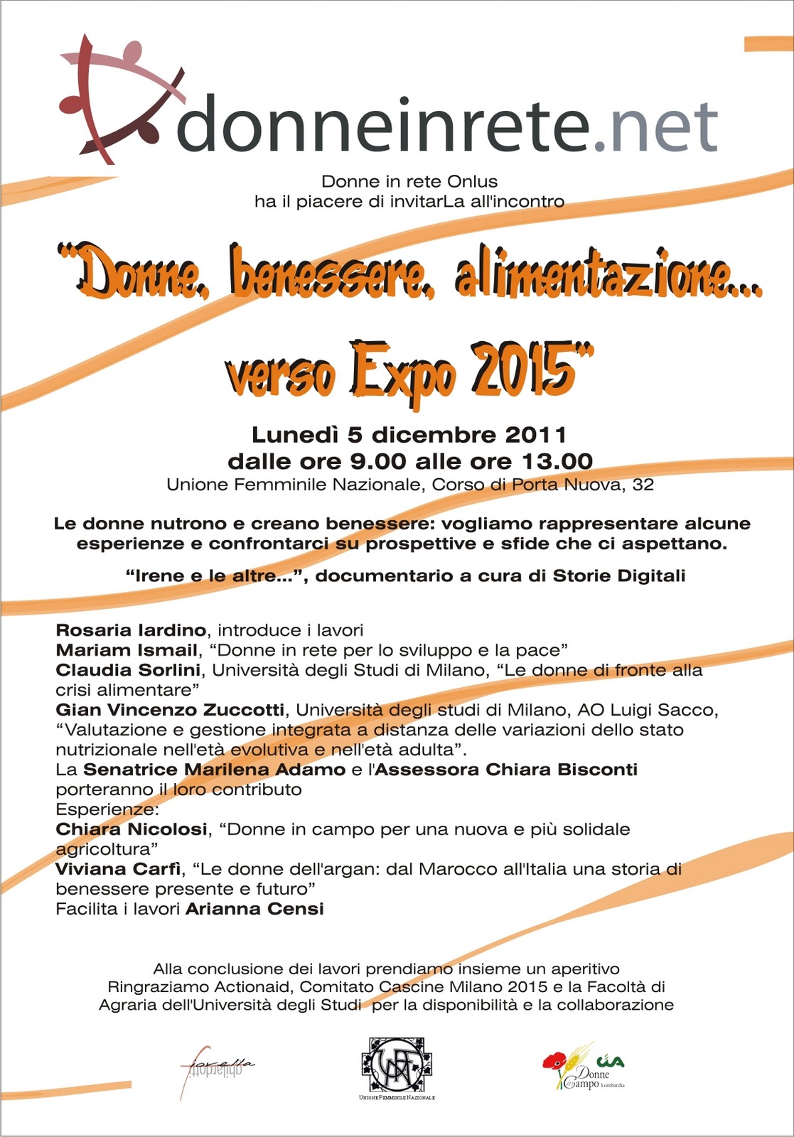 MILANO, 1 dicembre 2011. Riprendiamo in mano il tema alla base di Expo 2015, dopo mesi in cui sull’argomento si è molto discusso senza vedere una progettualità condivisa. Feed The Earth è il titolo con cui Milano ha vinto l’assegnazione del prestigioso evento. Donne in rete onlus intende quindi offrire una prima declinazione al femminile sul tema dell’alimentazione. “Donne, benessere, alimentazione…verso Expo 2015”, in programma lunedì 5 dicembre 2011 presso la sede di Unione femminile nazionale in Corso di Porta Nuova 32 a Milano, sarà un momento di riflessione e confronto che sappia predisporre Milano a un atteggiamento costruttivo verso l’Expo 2015. Un modo cioè per tornare a discutere di temi importanti, allo scopo di creare quella sensibilità necessaria che potrà decretare il successo di Expo 2015 ad un livello di coscienza individuale e collettiva. Non solo quindi in termini istituzionali. «Le donne nutrono e creano benessere: vogliamo rappresentare alcune esperienze e confrontarci su prospettive e sfide che ci aspettano», è lo slogan con cui l’iniziativa vuole farsi conoscere. L’iniziativa si svolgerà attraverso diversi momenti di dibattito, racconto di esperienze e iniziative individuali, all’interno dei quali verrà presentato il documentario Irene e le altre…, estratto al femminile dal Progetto “Il patrimonio rurale immateriale delle cascine di Milano”-documentario sulla memoria agricola del territorio milanese, realizzato da StorieDigitali, Comitato Cascine Milano 2015, Facoltà di Agraria, Distretto agricolo milanese e Archivio Etnografico di storia sociale della Lombardia, regia e fotografia di Giuseppe Baresi . Sarà allestita la mostra fotografica Il pane e la rosa, dedicata alle donne agricoltrici del sud del mondo, realizzata da ActionAid.